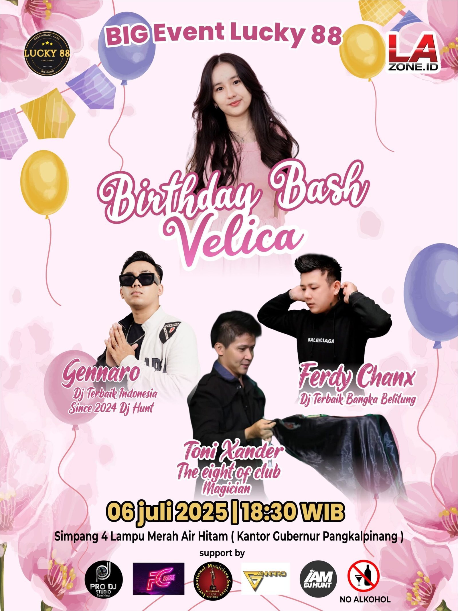 Pangkalpinang,- Big Event Lucky 88 Resto ,Cafe and Billiard  dihari yang spesial,minggu (06/07/2025), menghadirkan  Gennaro DJ Terbaik IAM DJ HUNT INDONESIA 2024 dan DJ Terbaik Bangka Belitung Ferdy Chanx , bukan hanya sekedar 2 DJ ternama tersebut yang hadir melainkan ada penampilan yang tak kalah menarik yaitu penampilan Magician dari Toni Xander yang siap meramaikan hari Ulang Tahun ke 17 (Seventeen)Putri Sulung dari pengusaha ternama asal Bangka Belitung Sujono,SH,MH alias Athau .