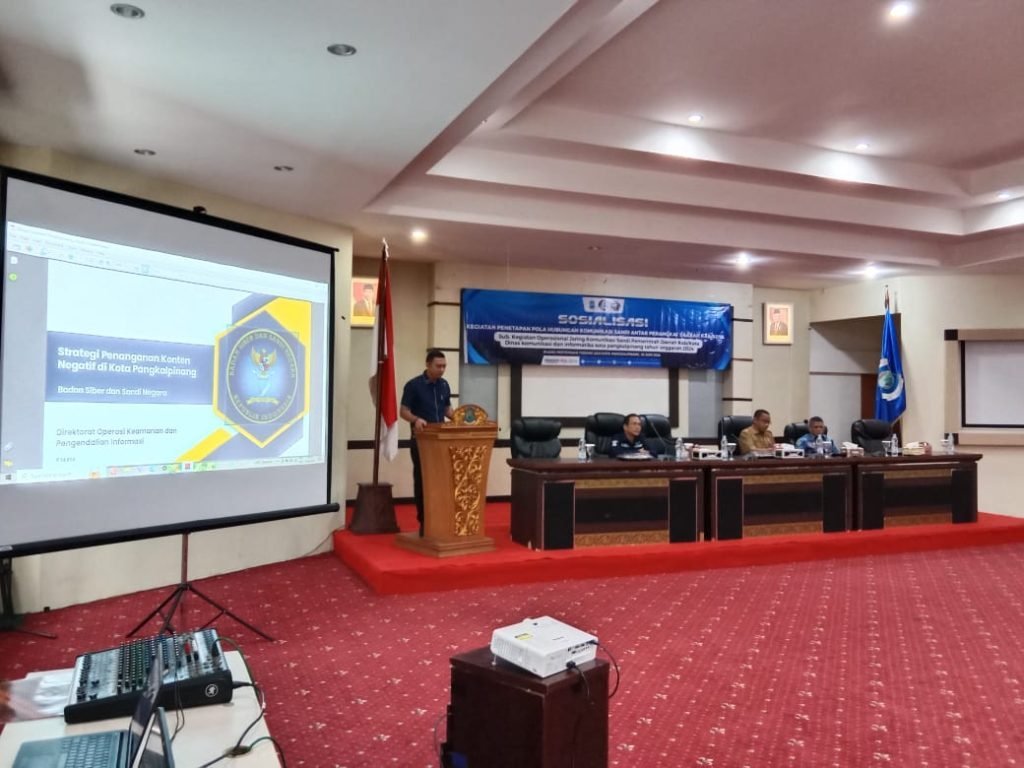 PANGKALPINANG, – Dalam rangka mensosialisasikan penetapan pola hubungan komunikasi sandi antar Perangkat Daerah, Sub. Kegiatan Operasional Jaring Komunikasi Sandi Pemerintah Daerah Dinas Komunikasi dan Informatika Kota Pangkalpinang gelar paparan materi oleh Direktur Operasi Keamanan dan Pengendalian Informasi Badan Siber dan Sandi Negara Republik Indonesia di Ruang Pertemuan OR Kantor Wali Kota Pangkalpinang, Selasa (25/6/2024).